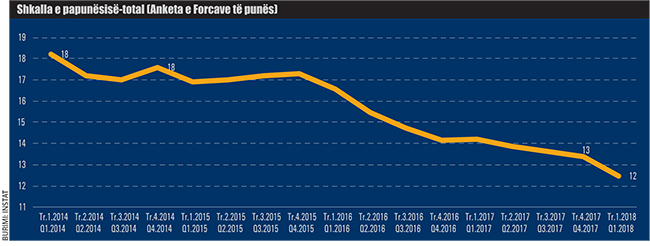 Sipas të dhënave zyrtare të INSTAT që i referohen Anketës së Forcave të Punës në tremujorin e parë të vitit u raportuan si të punësuar 1,226,157 persona ose 9548 persona më shumë se në fundin e vitit 2017. Shifrat tregojnë se numri i të punësuarve rishtaz në tremujorin e parë është shumë më i ulët se ulja e të papunëve, të cilët ishin 13,200 persona më pak. Kjo diferencë erdhi për shkak se forca e punës ka pësuar rënie në tremujorin e parë. Forca e punës, sipas INSTAT, përfshin personat e punësuar plus të papunët. Në janar-prill, forca e punës numëroi 1,400,694 persona ose 3,694 më pak se në fundin e vitit.
