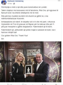 Faleminderit që, përkundër që preke majat e suksesit në botë, nuk i harrove rrënjët tua! Our golden Rita Ora. Thank You!”, shkruan Haradinaj në Facebook.