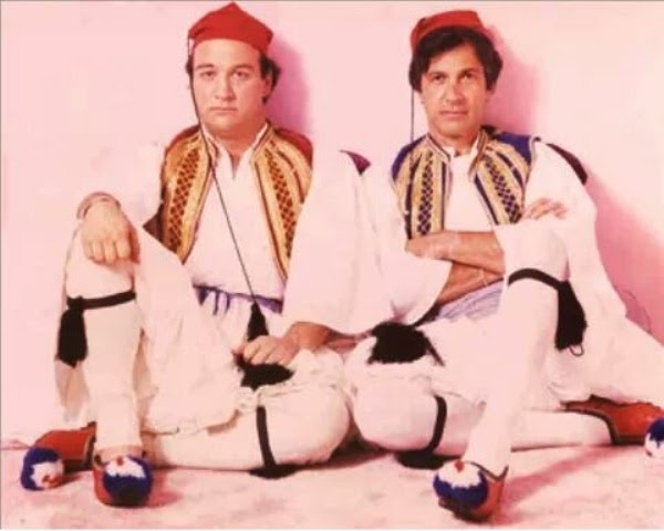 James Belushi dhe Stan Dragoti, dy artistët e mirënjohur shqiptarë të Hollywood-it, kanë veshur kostumet arvanitase dhe janë shfaqur në këtë fotografi fantastike në vitin 1985.