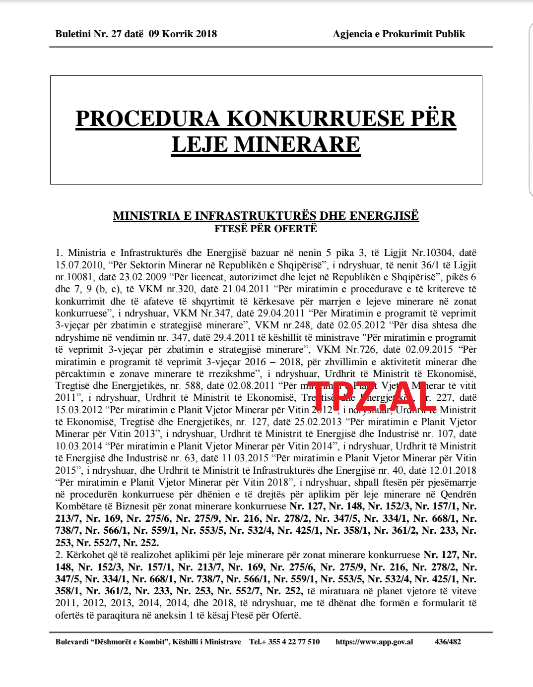 Në këtë njoftim thuhet se ministria, në bazë të ligjeve dhe rregulloreve, ndër të tjera ka vendosur të nxjerrë në ankand edhe zonën minerare konkurruese me nr. 148, të miratuar në planin vjetor minerar të vitit 2013, i ndryshuar, që shpallet në procedurë konkurruese për të drejtën e aplikimit për një leje minerare.