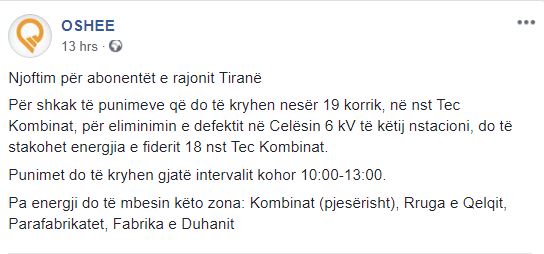 Operatori i Shpërndarjes së Energjisë Elektrike ka bërë një njoftim se duke nisur nga ora 10:00 e deri në orën 1 të drekës, shumë zona të kryeqytetit do të jenë pa drita.