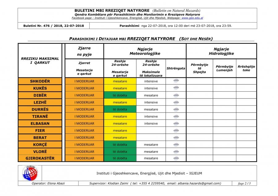 Sipas institutit të Gjeoshkencës, Energjisë, Ujit dhe Mjedisit (IGJEUM), reshjet do të jenë në pjesën më të madhe të vendit mesatare dhe lokalisht deri intensive.