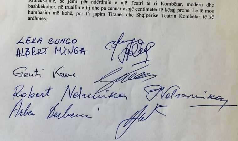 Ritheksojmë, se jemi për ndërtimin e një Teatri të ri Kombëtar, modern dhe bashkëkohor, në truallin e tij dhe pa cenuar asnjë centimetër të kësaj prone. Le të mos humbasim me kohë, por t’i japim Tiranës dhe Shqipërisë Teatrin Kombëtar të ardhmes”, shkruhet në peticion, ku janë listuar më pas emrat dhe firmat e aktorëve, regjisorëve dhe përfaqësuesve më të njohur të artit skenik shqiptar.