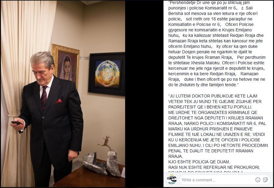 “Pershendetje Dr une qe po ju shkruaj jam punonjes i policise Komisariatit nr 6, z. Sali Berisha sot mesova sa vlen lekura e nje oficeri policie, sot rreth ore 18 eshte paraqitur ne Komisatiatin e Policise nr 6, Oficeri Policise gjyqesore ne komisariatin e Krujes Emiljano Nuhu, ku ka kallezuar shtetasit Redjan Rraja dhe Ramazan Rraja keta shtetas kan kanosur me jete oficerin Emiljano Nuhu, ky oficer ka qen duke hetuar Dosjen penale ne ngarkim te djalit te deputetit Te krujes Rraman Rraja, Per perdhunim te shtetase Xhesila Maloku. Oficeri i Policise eshte kercenuar me jete nga njerzit e deputetit te krujes, kercenimin e ka bere Redjan Rraja, Ramazan Rraja, duke i then oficerit qe po na hetove me ne do te zhdukim ty dhe familjen tende.”