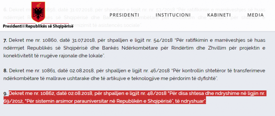 Presidenti i Shqipërisë Ilir Meta ka dekretuar sot ligjin Nr. 48/2018, “Për disa shtesa dhe ndryshime në ligjin Nr. 69/2012 për sistemin arsimor parauniversitar në Republikën e Shqipërisë”, ku janë përfshirë propozimet e parashtruara në Strategjinë e re për Diasporën.