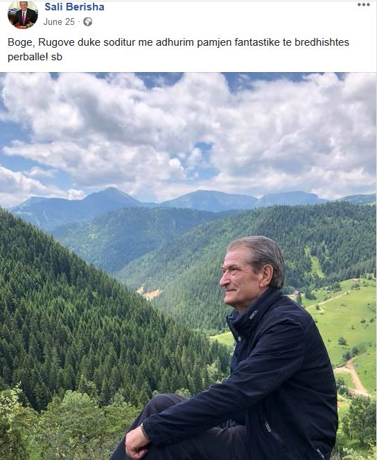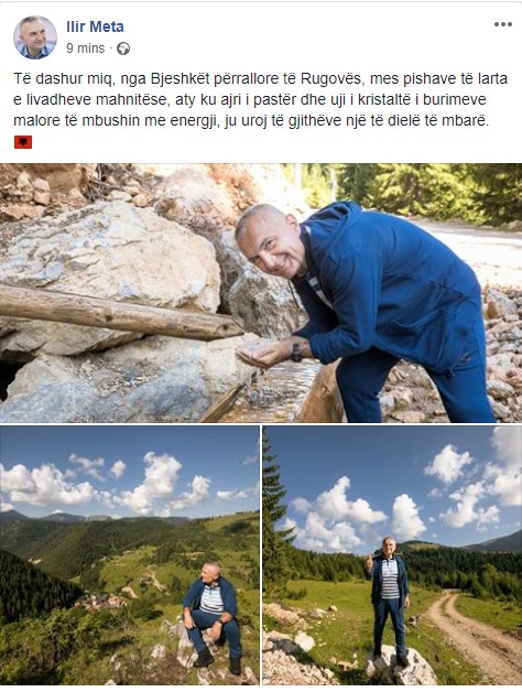 “Të dashur miq, nga Bjeshkët përrallore të Rugovës, mes pishave të larta e livadheve mahnitëse, aty ku ajri i pastër dhe uji i kristaltë i burimeve malore të mbushin me energji, ju uroj të gjithëve një të dielë të mbarë”, shkruan Meta në facebook.