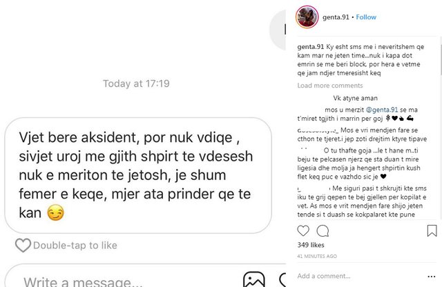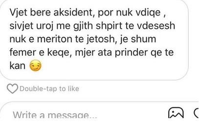 ”Vjet bëre aksident, por nuk vdiqe, sivjet uroj me shpirt të vdesësh nuk e meriton të jetosh, je shumë femër e keqe, mjerë ata prindër që të kanë,”- i ka shkruar dikush në faqen e saj në instagram.