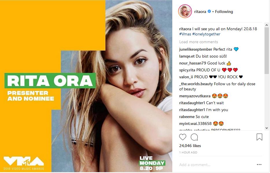 “Shihemi të hënën më 20.08.18#Vmas #lonelytogether”- shkruan ajo duke e shoqëruar edhe me një foto të sajën. Këngëtarja me origjinë shqiptare është e nominuar në kategorinë “Best dance” për hitin e saj me këngëtarin Avicii “Lonely Together”. Kështu është ajo dhe konkurrente përveçse moderatore.