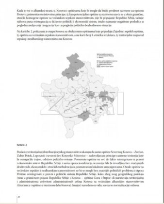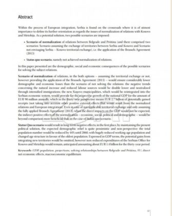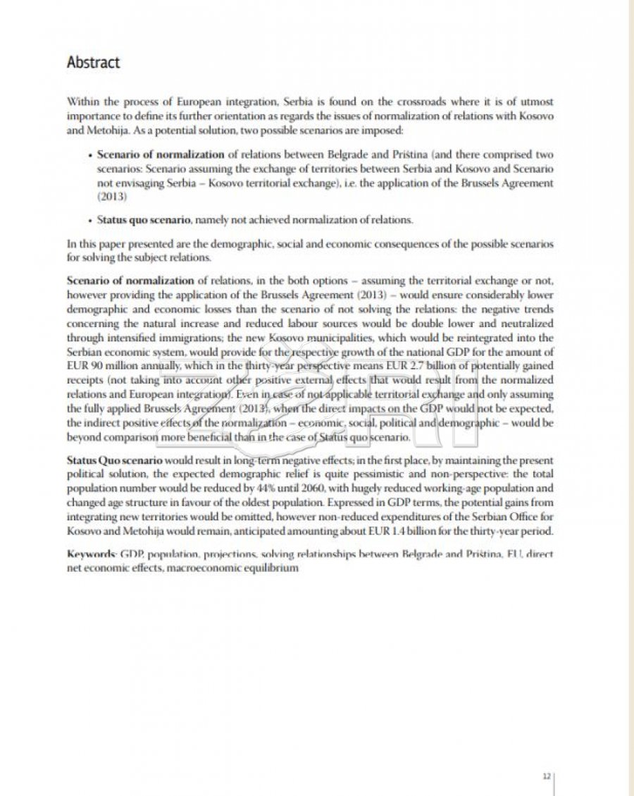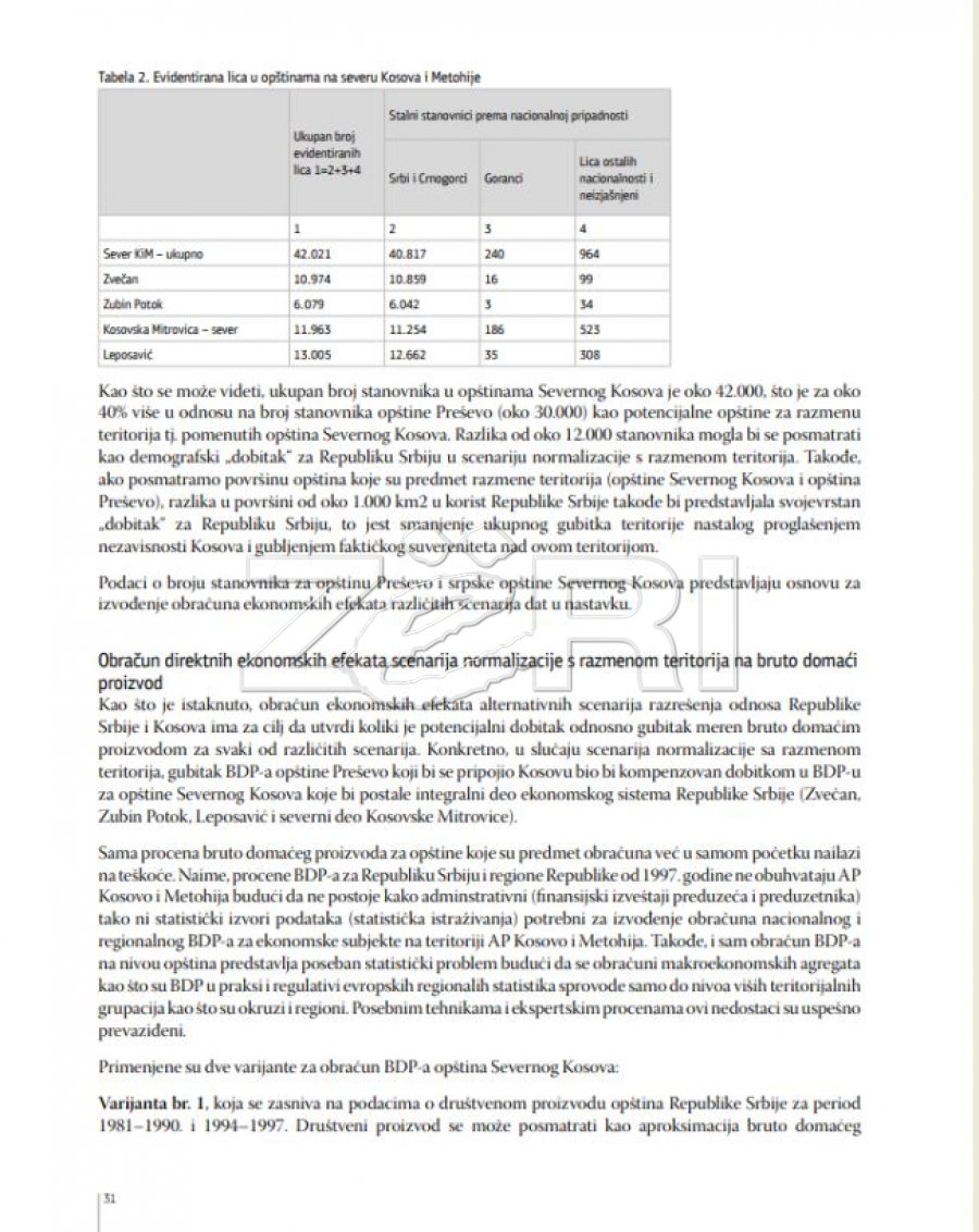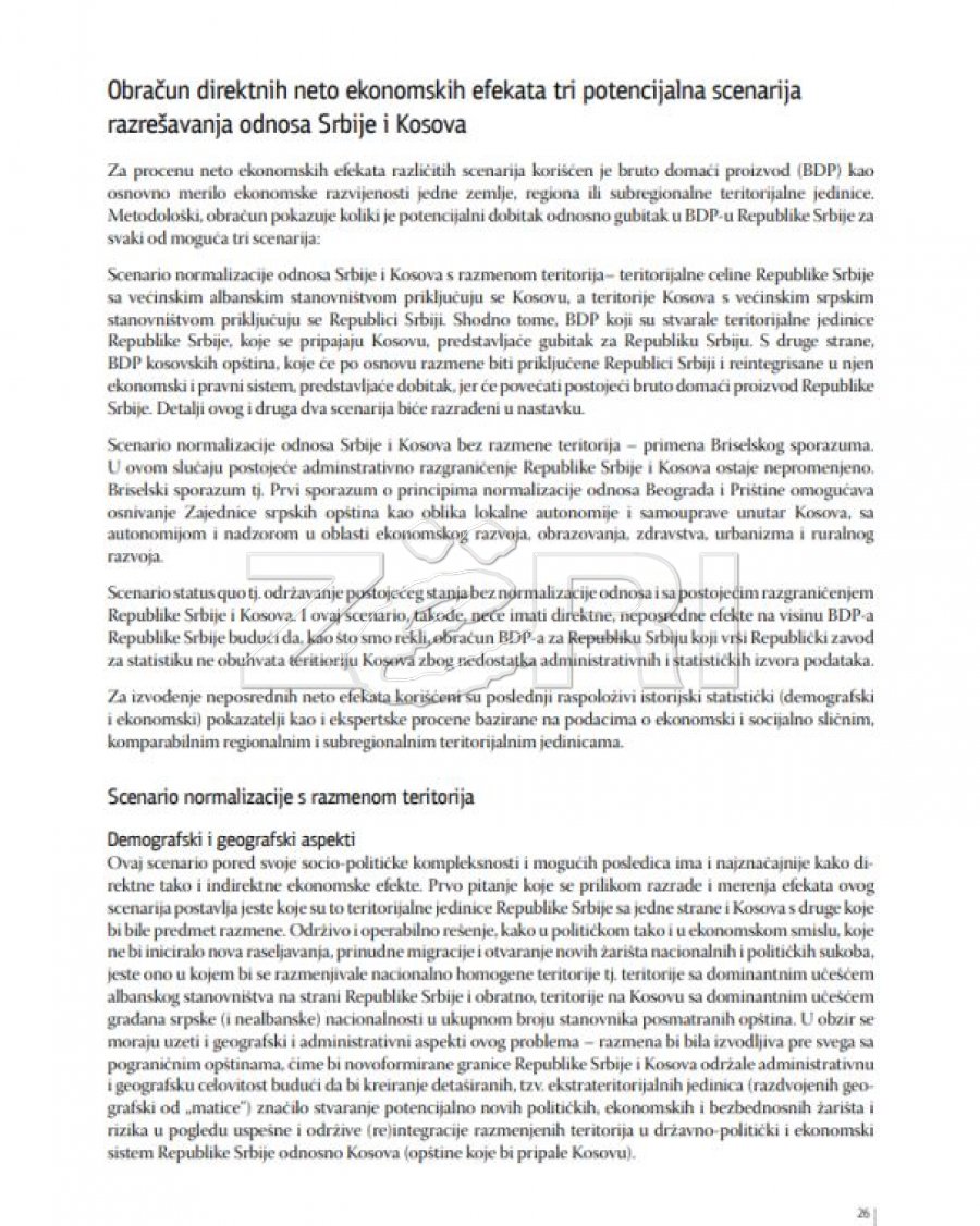 Ky raport në mënyrë të detajuar flet për efektet ekonomike, demografike e sociale dhe për ide të ndryshme për normalizimin e raporteve në mes të dyja vendeve. Në document propozohet që Kosova të marrë vetëm Preshevën, ndërsa Serbia katër komunat veriore të vendit, ndër të tjera përmenden përfitimet nga ky skenar prej 2.7 miliardë eurosh për shtetin fqinj.