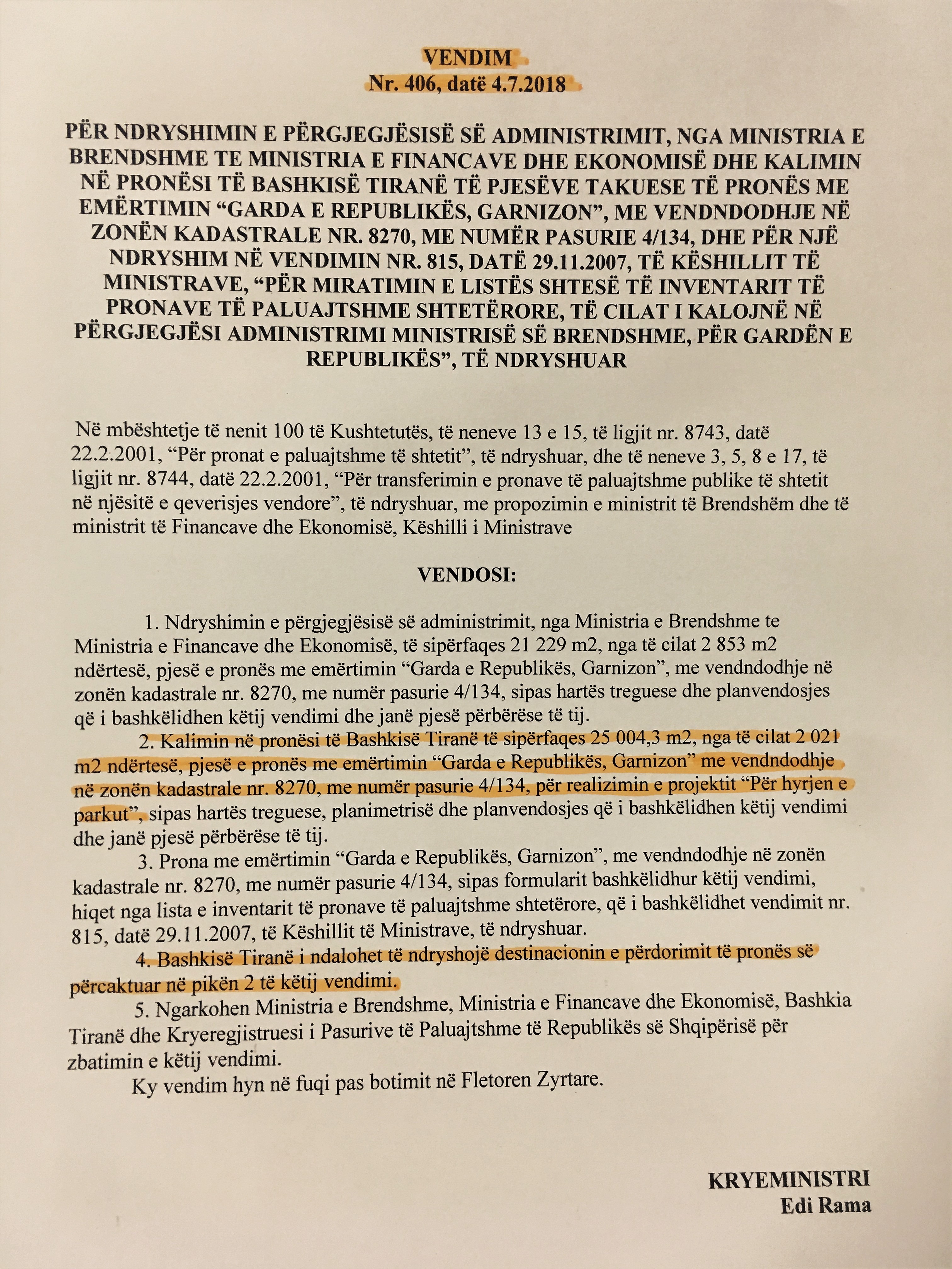 Sipas dokumentave zyrtare që disponon partia demokratike, në kriteret e vendosura të tipologjisë së ndërtimit për këtë zonë TR169 ku shtrihet oborri i Gardës së Republikës , zona është miratuar me destinacion ku do të ndërtohen struktura lineare të gjata që quhen kullë, ku do të ofrojnë shërbime biznesi, banimi, parkingje etj.