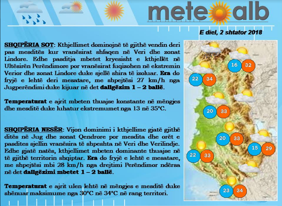 Temperaturat e ajrit do të vazhdojnë të jenë të larta. Fillimisht do të mbeten konstante në mëngjes dhe pastaj në mesditë do të arrijnë ekstremumet nga 13-35 gradë celcius.