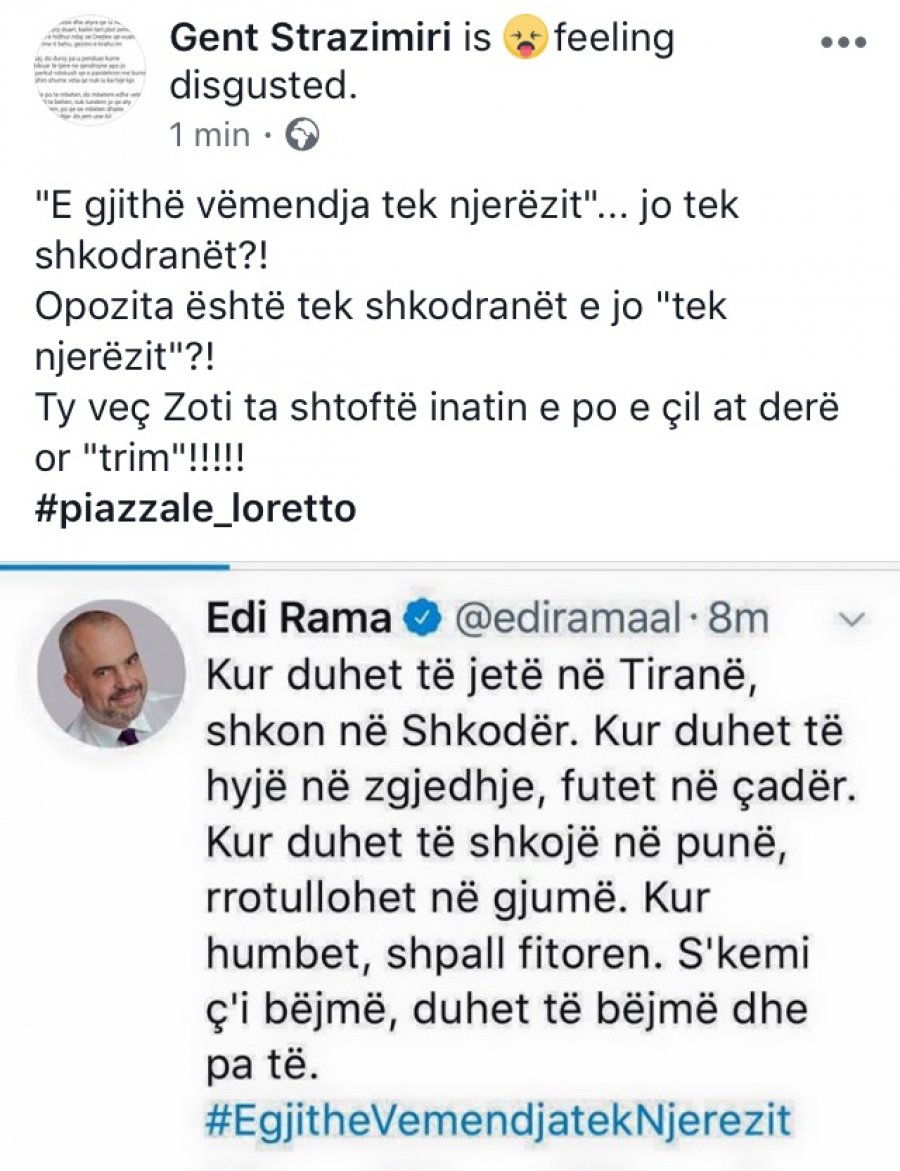 Deputeti i PD-së, Gent Strazimiri i është përgjigjur kryeministrit Rama pas reagimit me ironi të tij, për mbledhjen e opozitës së bashkuar të zhvilluar pasditen e sotme në Shkodër.
