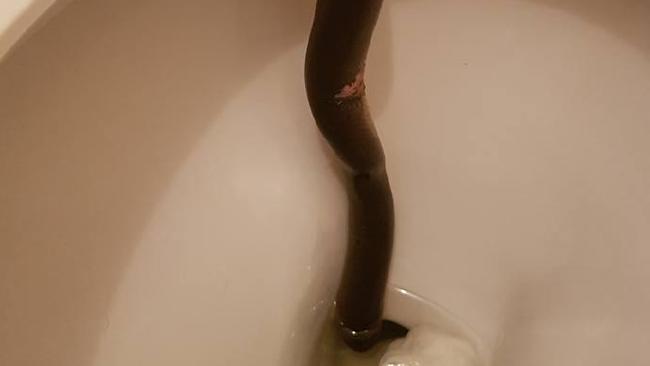 Një grua gjeti në tualetin e saj një gjarpër të përmasave të mëdha. Gjarpëri ishte një piton, i cili më pas u hodh në pjesën e prapme të dhomës.
