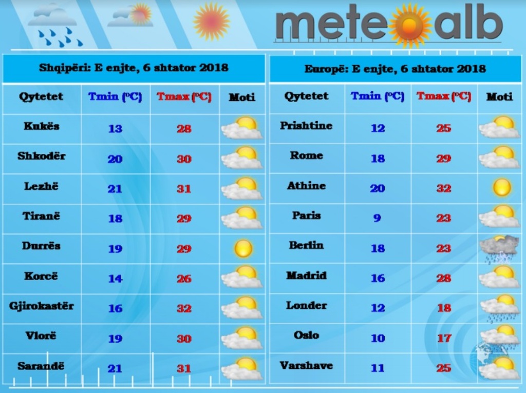 Vazhdojnë të dominojnë temperaturat e larta, sidomos në jug dhe pjesën qëndrore të vendit. Përjashtuar këtu Verilindjen dhe zonat Lindore ku pasditja fuqizon vranësirat duke gjeneruar shira të përkohshëm.