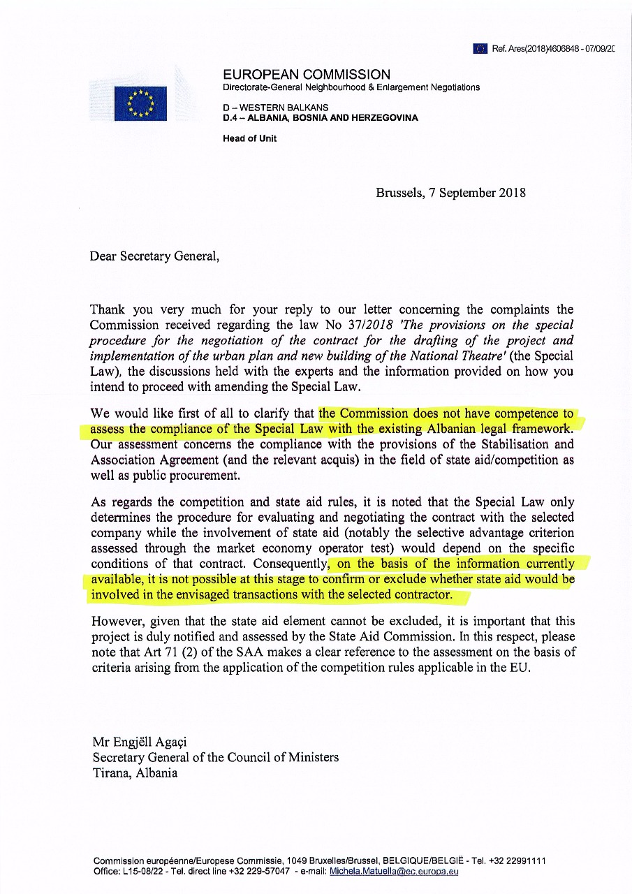 “Artikulli 74(3) i MSA-së i referohet dhënies së aksesit të barabartë kompanive private që duan të lidhin kontrata, duke u bazuar në Ligjin Shqiptar mbi Prokurimet Publike dhe jo mbi acquis-të e Bashkimit Europian. Ndonëse, në këtë pikë nuk vërejmë asnjë shkelje të MSA-së, Komisioni Europian mirëpret vullnetin e autoriteteve Shqiptare për ta amenduar Ligjin Special, me qëllim hapjen e garës për projektin e Teatrit Kombëtar, në mënyrë që çdo kompani private të mund të aplikojë një propozim për projektin”.