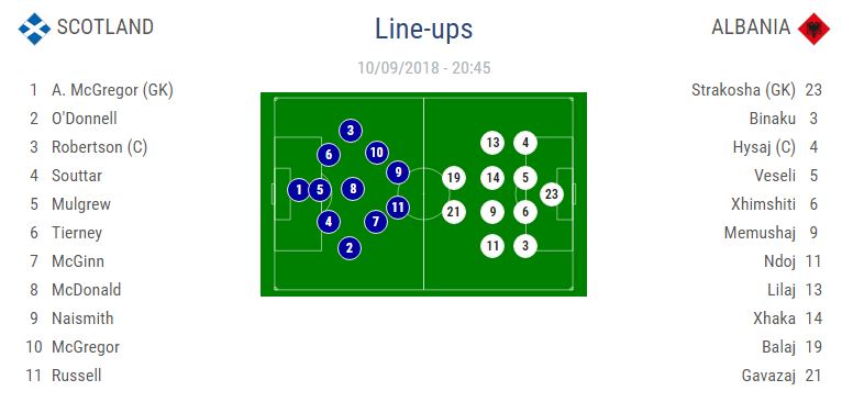 Uefa ka publikuar formacionet zyrtare të takimit Skoci-Shqipëri, që do të nisë në orën 20:45 në “Hampden Park” të Glasgow-t.