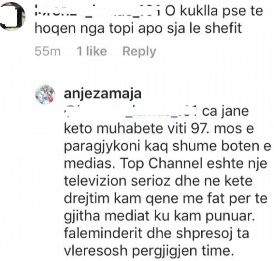 “Ç’janë këto muhabete viti ’97? Mos e paragjykoni kaq shumë botën e medias. “Top Channel” është një televizion serioz dhe në këtë drejtim kam qënë me fat për të gjitha mediat ku kam punuar. Faleminderit dhe shpresoj ta vlerësosh përgjigjen time” – është përgjigjur Anjeza ndaj komentuesit./Intv/
