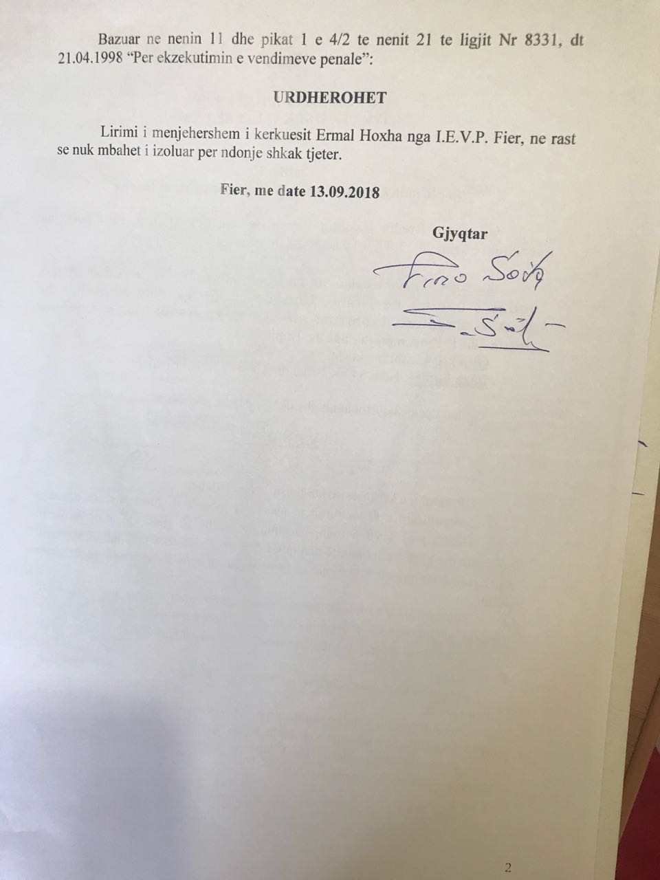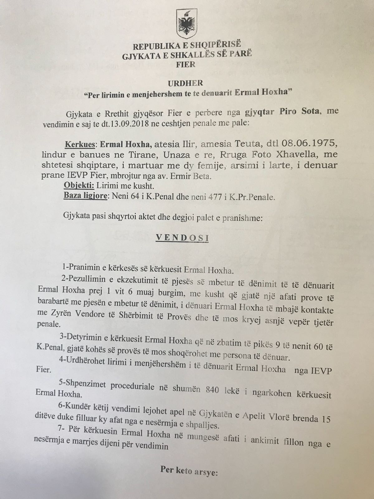Duke qenë se ka qëndruar për një kohë të gjatë në paraburgim, Hoxha e ka shlyer masën më të madhe të dënimit. Ai i është drejtuar Gjykatës së Fierit për lirim me kusht dhe kërkesa është shqyrtuar nga gjyqtari Piro Sota më 20 gusht të këtij viti. Më pas, vendimi është marrë më 13 shtator, kur Hoxhës i kishin mbetur edhe 1 vit e 8 muaj për të kryer nga dënimi i tij.