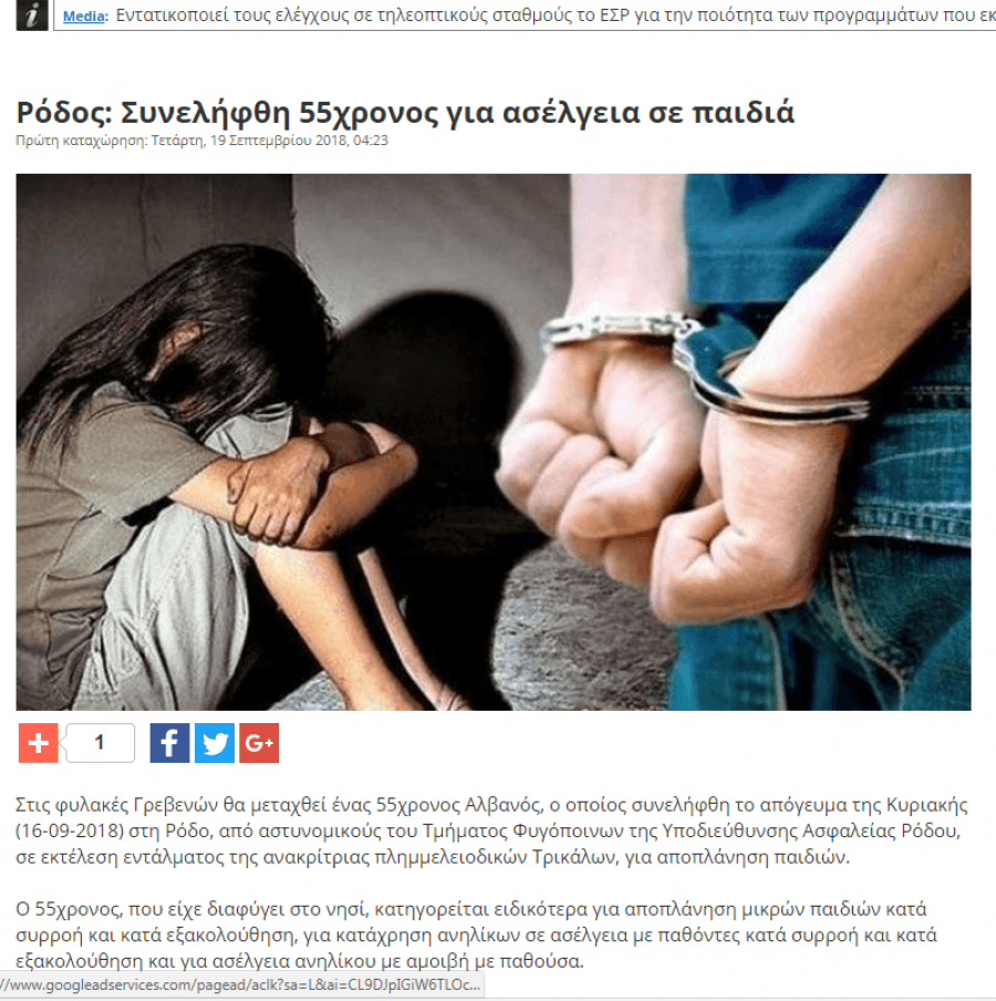 Një 55-vjeçar shqiptar, i cili u arrestua pasditen e së dielës në datën 16 shtator 2018 nga policia e Rodosit, pas urdhrit të lëshuar nga Prokuroria në Trikala i akuzuar për abuzim me fëmijët, është transferuar nga burgu i Grevenasë, ndërsa bëhet publike gjithë veprimtaria e tij abuzive më të mitura që nga viti 2003.