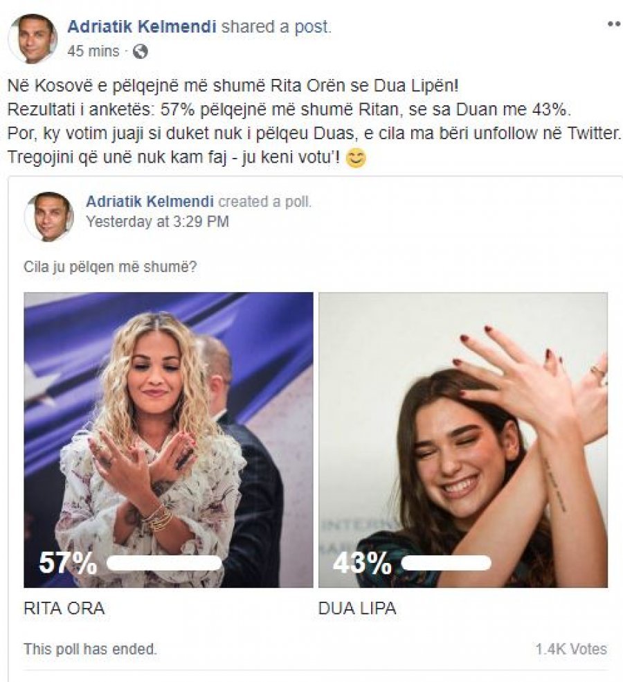 Kelmendi ka treguar se me këtë rast, Dua ka reaguar duke ia fshirë nga lista e ndjekësve të saj në rrjetin sociale Twitter, ndërsa ai shkruan se nuk është faji i tij aspak.