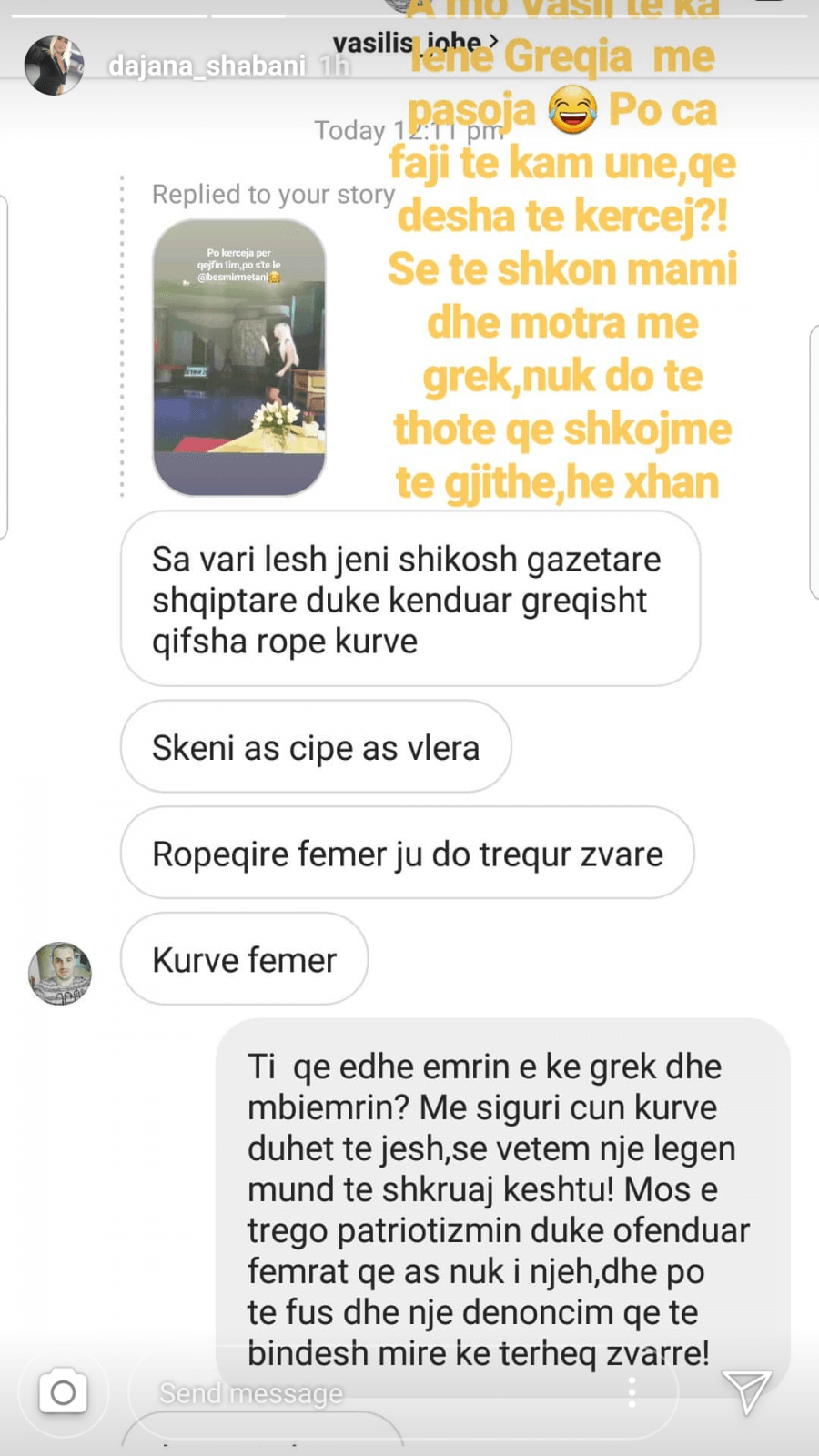 Mirëpo, kjo gjë duket se nuk i ka pëlqyer një fansi të Dajanës, i cili i ka shkruar në privat dhe e ka ofenduar, duke e quajtur ndër të tjera, edhe spiune të grekëve.