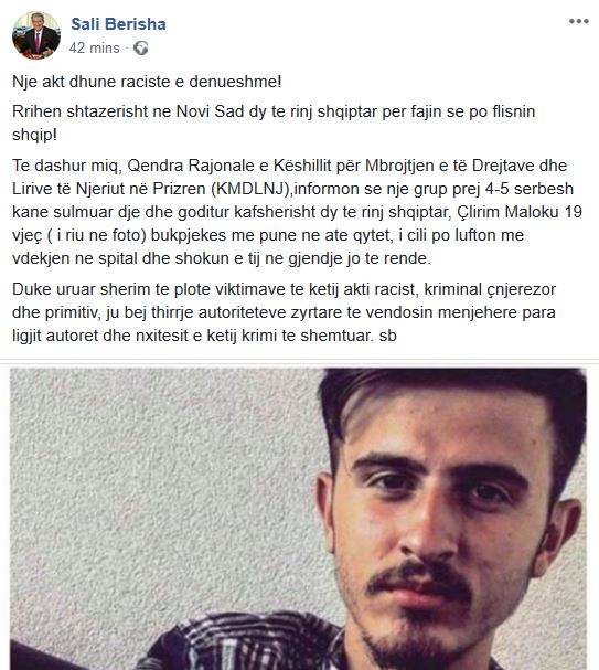 Ish-kryeministri Berisha ka reaguar në rrjetin e social ‘Facebook’ lidhur me ngjarjen e rëndë të dhunimit të dy shqiptarëve në Serbi.