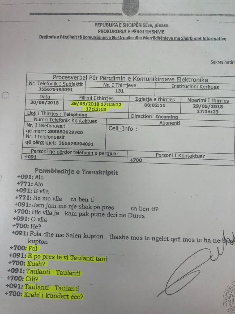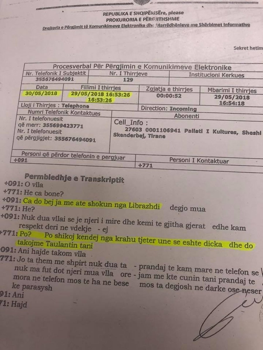 Ish-kryeministri Sali Berisha ka publikuar në Facebook, dokumentet  e përgjimeve ku shihet sesi  Fredi Alizoti tregon se është paguar nga taulant Balla për të mbrojtur Agron Xhafën.