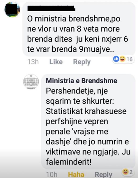 Ndërsa përgjigja e Ministrisë së brendshme është, “Përshendetje, një sqarim teë shkurter: Statistikat krahasuese përfshijne vepren penale ‘vrajse me dashje’ dhe jo numrin e viktimave në ngjarje. Ju faleminderit!”.