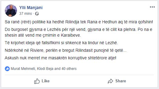 Ylli Manjani në një reagim në rrjetet sociale shkruan se do të burgoset gjysma e Lezhës për ”Rana e Hedhun”, e cila sipas tij, është gjysma me plehra.