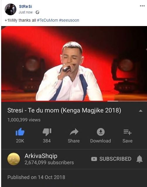 Bëhet fjalë për këngën e re të ri me të cilën do të konkurrojë tek festivali ‘Kënga Magjike 2018’. Stresi ka falenderuar të gjithë fansat dhe ndjekësit që kanë çuar numrin e klikimeve në 1 milion.
