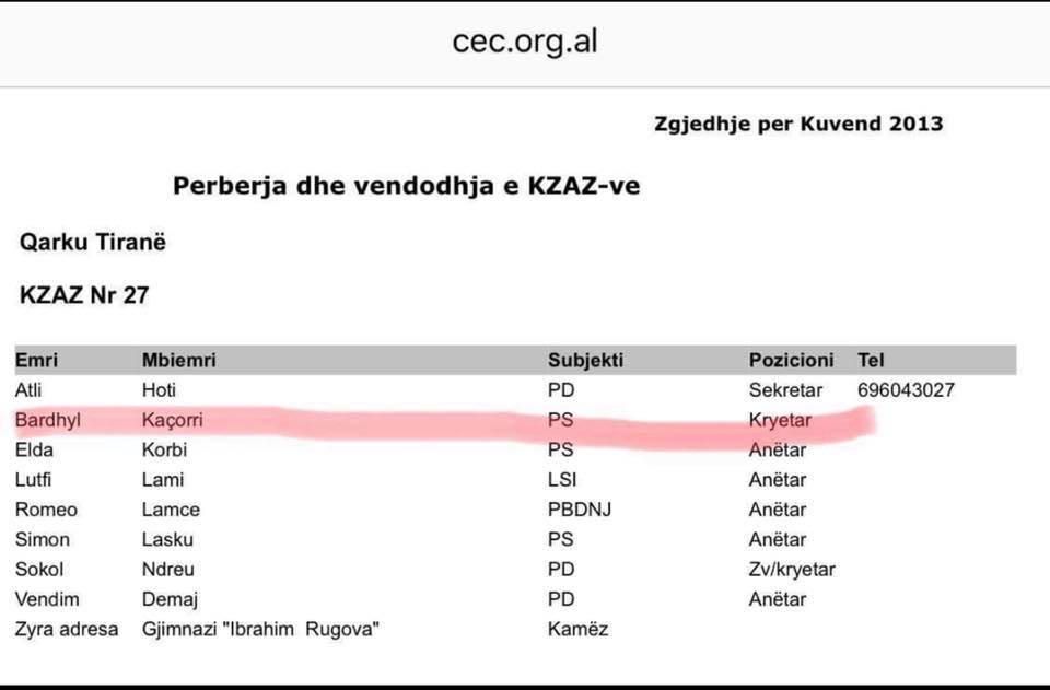 Bardhyl Kaçorri ka qenë Kryetar I KZAZ 27 në Tiranë si përfaqësues i PS në zgjedhje.
