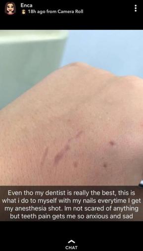 “Edhe pse dentisti im është i mirë ja çfarë i bëj vetes me thonj sa herë që jam në anestezi. Nuk kam frikë nga asgjë por dhimbja e dhëmbit më streson dhe më mërzit”, shkruan Enca.