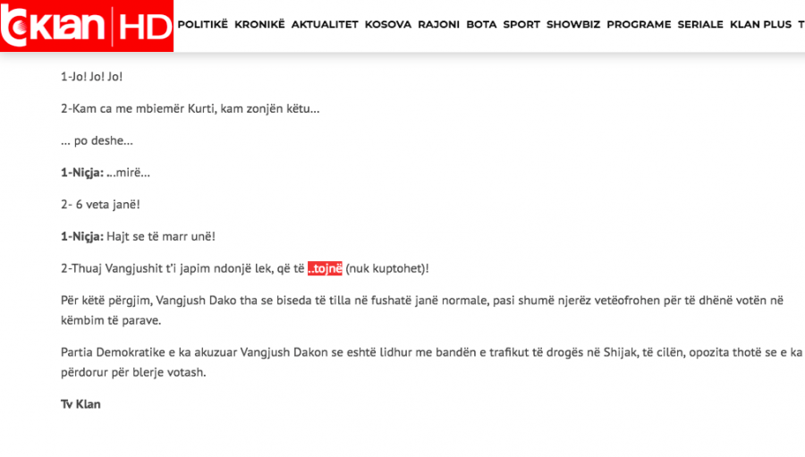 Në fund të bisedës mes Altin Avdylit dhe një personi tjetër, përmendet Vangjushi. Personi i paidentifikuar i thotë Avdylit, që t’i kërkojë Vangjushit para, që disa persona të “votojnë”. Por në versionin e publikuar nga Tv Klan, fjala “votojnë”, është zëvendësuar me “…tojnë (nuk kuptohet!)”.