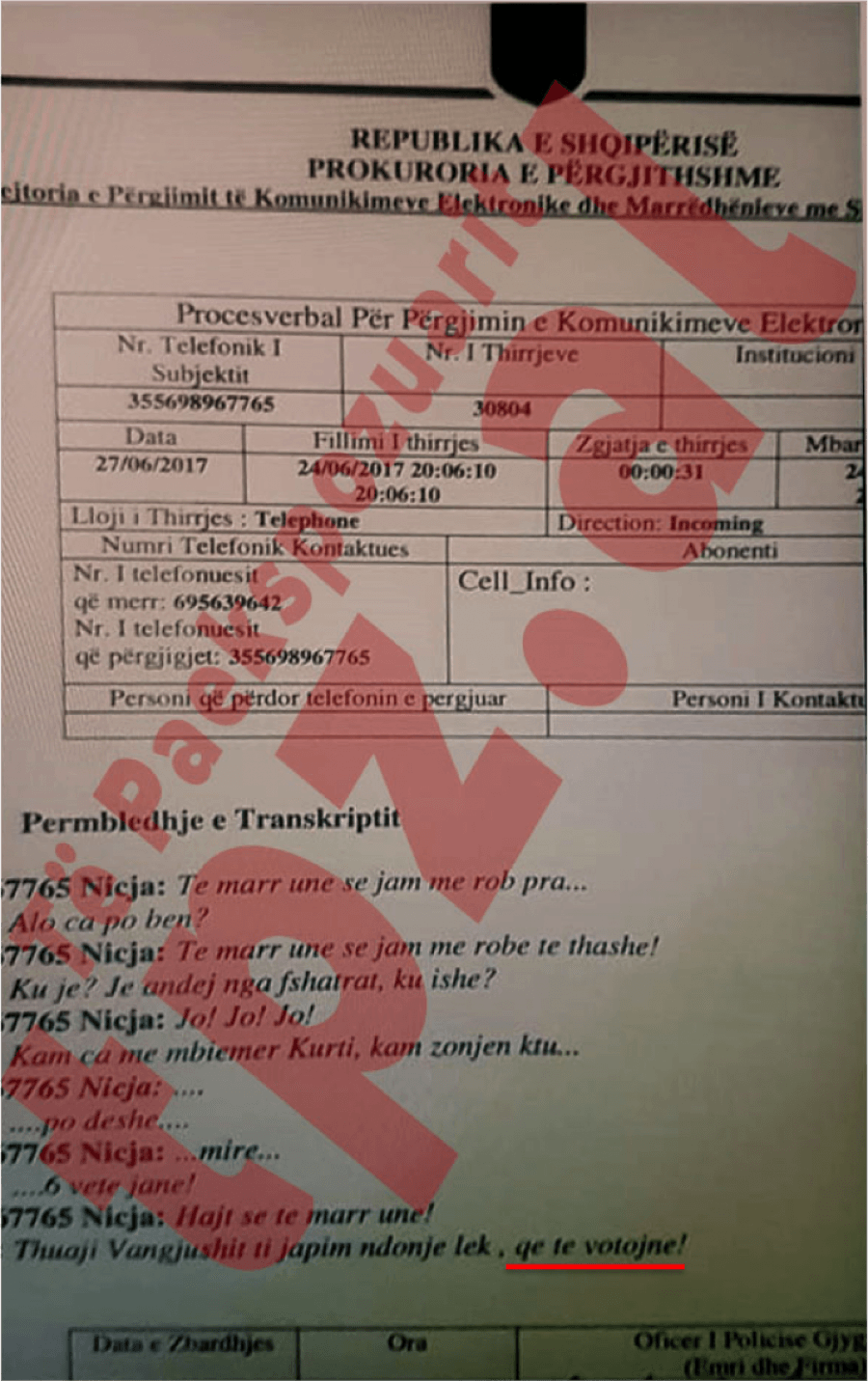 TPZ siguroi një dokument ekzkluziv, të prokurorisë, me transrikptin e bisedës së Vangjush Dakos, me njërin prej anëtarëve të bandës së Shijakut, Altin Avdyli dhe një bisedë tjetër mes Avdylit dhe një personi që kërkon para nga “Vangjushi” për të blerë vota.