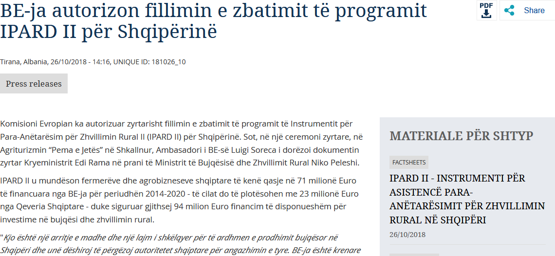 IPARD II u mundëson fermerëve dhe agrobizneseve shqiptare të kenë qasje në 71 milionë Euro të financuara nga BE-ja për periudhën 2014-2020 – të cilat do të plotësohen me 23 milionë Euro nga Qeveria Shqiptare – duke siguruar gjithsej 94 milion Euro financim të disponueshëm për investime në bujqësi dhe zhvillimin rural”.