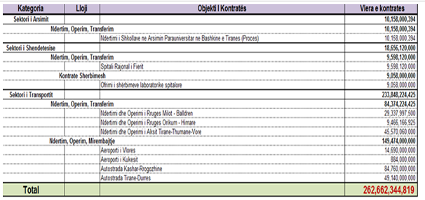 Të gjitha koncesionet reja që pritet të nënshkruhen vitin që vjen me PPP që përfshijnë shkollat në Tiranë, Spitalin rajonal të Fierit, 6 akse rrugore dhe dy aeroporte kushtojnë gjithsej 262 miliardë lekë, duke e kaluar vlerën e 2 miliardë eurove.