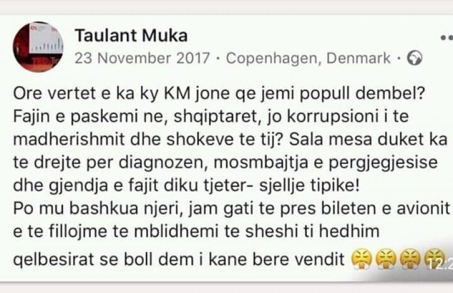 Lexoni se çfarë shkruante Taulant Muka nga Kopenhagen, më 23 Nëntor, të vitit të kaluar: