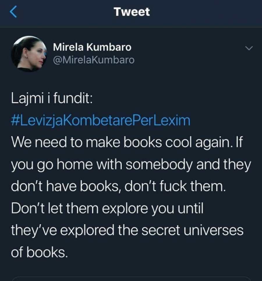 Postimi i saj i fundit në Twitter ka shkaktuar reagime mes njerëzve, por dhe deputetëve. Ajo është një shprehje për të nxitur njerëzit të lexojnë dhe është marrë nga John Waters e cila thotë se nëse ‘përfundoni me dikë në shtëpi, dhe ai/ajo s’ka libra, atëherë mos shkoni në shtrat me të’.