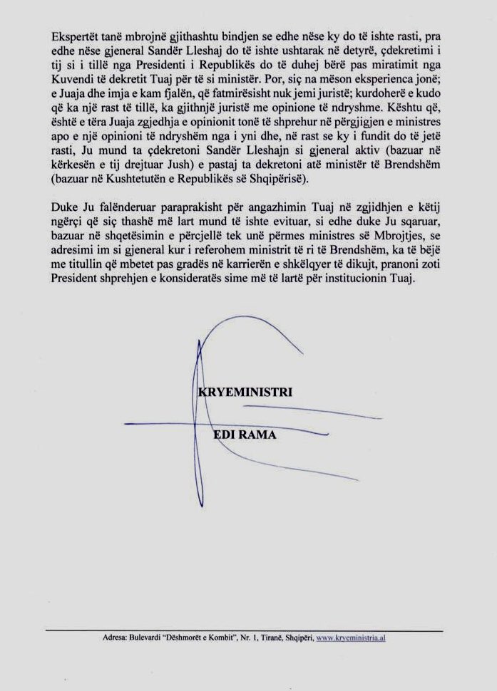 ”Kjo sepse ushtarakët e shërbimit aktiv nuk mund të zgjidhen ose të emërohen në detyra të tjera shtetërore dhe as të marrin pjesë në parti ose në veprimtari politike, ndërkohë që një ushtarak i shërbimit aktiv nuk mund të kandidojë e as të zgjidhet ministër apo deputet pa hequr dorë më parë nga detyra”, thuhej në letrën e Presidentit.