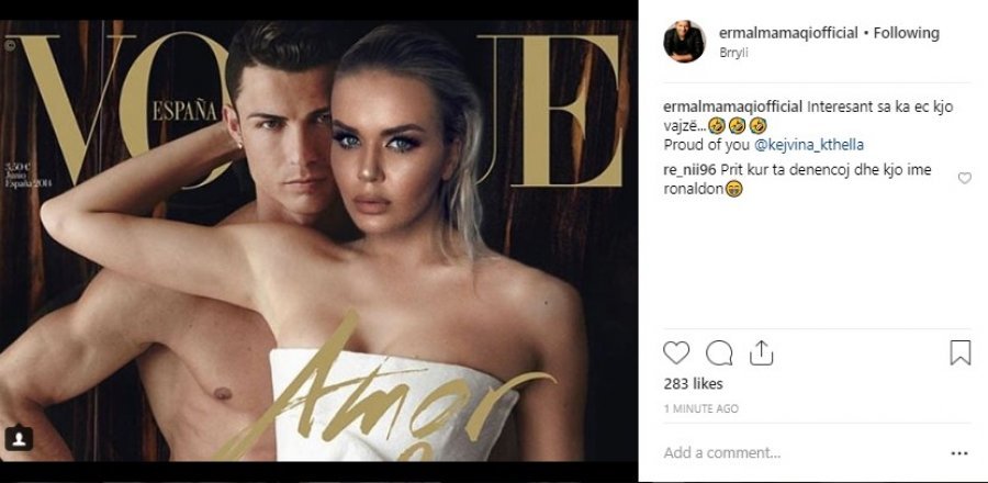 Këtë herë ai ka publikuar një foto-montazh ku shfaqet velina e emisionit të tij Kejvina Kthella në shtrat me futbollistin e njohur Cristiano Ronaldo. Krahas fotos Ermali ka shkruar: “Interesant sa ka ec kjo vajzë… Krenar për ty Kejvina Kthella.” Mbetet për të parë si do të reagojë bukuroshja ndaj këtij postimi të Mamaqit.