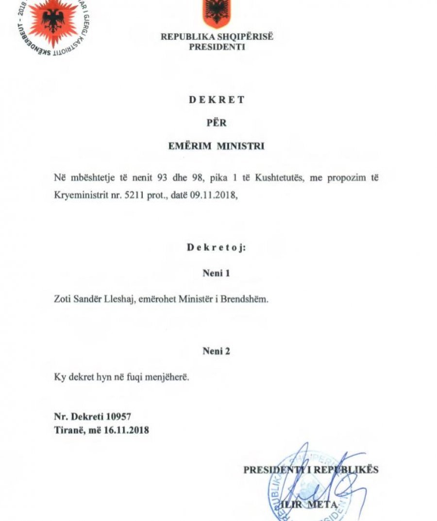 Kuvendi i Shqipërisë ka miratuar mbrëmjen e djeshme, dekretin e Presidentit Ilir Meta të datës 16 nëntor 2018 për emërimin e Sandër Lleshajt si Ministër i Brendshëm.