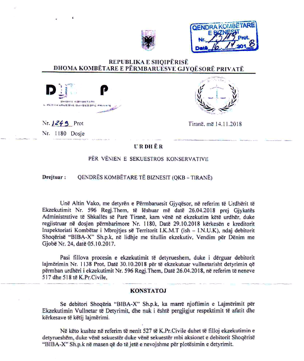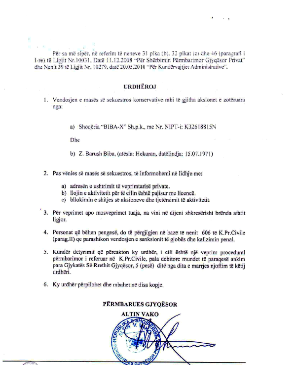 Dokumenti i publikuar nga PD mban datën 14 Nëntor dhe tregon se Përmbarimi ka vendosur në sekuestro me ekzekutim të detyrueshëm të gjitha asetet e kompanisë Biba X; konkretisht në kuotat ligjore të kompanisë, pasuritë e luajtshme dhe të paluajtshme, kantiere aktive të ndërtimit, llogari bankare etj.