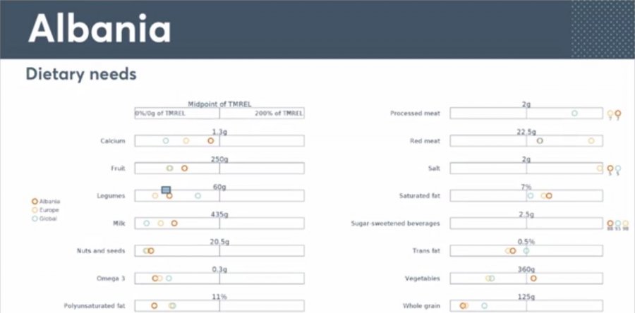 Po të shohim tabelën e dietës dhe nevojave që plotësojmë ose jo, ka mjaft hapësira për alarm. Jemi të tejngopur me produktet e mishit të përpunuar, por edhe me mish, ndërkohë që vuajmë për fruta, qumësht, fruta të thata, si dhe ushqime që përmbajnë “Omega 3”.