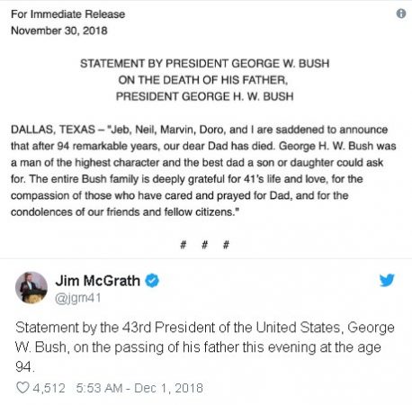 Në prill, ai u shtrua në spital me një infeksion gjaku. Presidenti Bush vdiq shtatë muaj pas gruas së tij, Barbara.