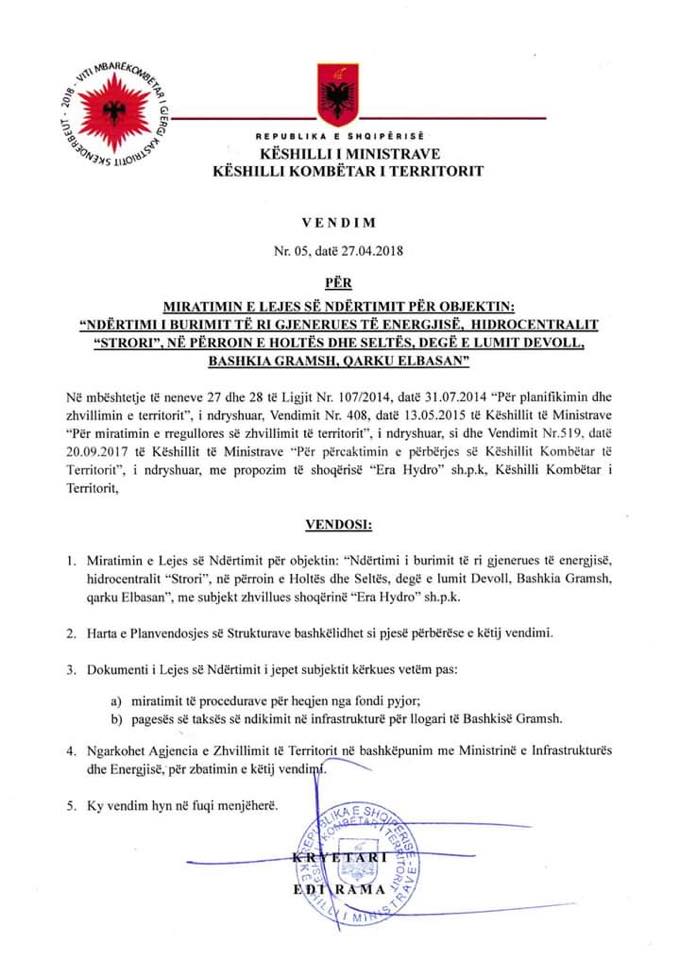 Ai ka publikuar në “Facebook” dokumentet e firmosura nga kryeministri Rama dhe ministri i Infrastrukturës Damian Gjiknuri, ku miratohet ndërtimi i një dige në kanionin e Holtës, në bashkinë Gramsh.