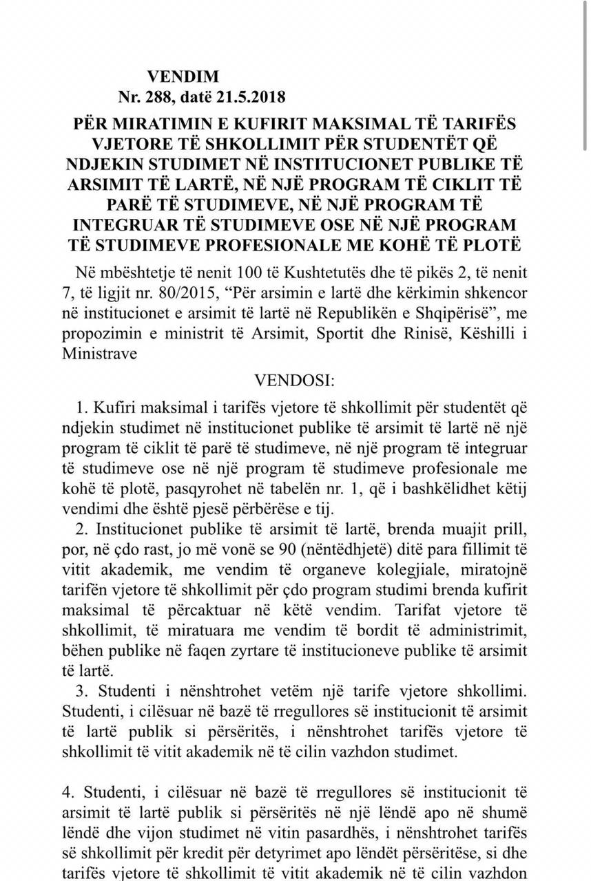 Duke iu referuar VKM-së fundit, Tabaku thotë se ky ligj rrit tarifat për studentët.