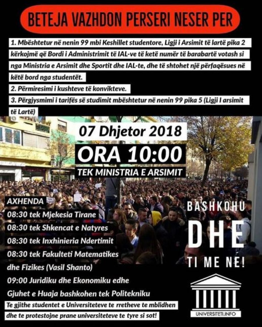 ‘Në orën 10:00, bashkohemi e protestojmë të gjithë para Ministrisë së Arsimit! Nuk ndalemi deri në realizimin e plotë të kërkesave! Thërrasim, këndojmë e protestojmë të gjithë së bashku”.