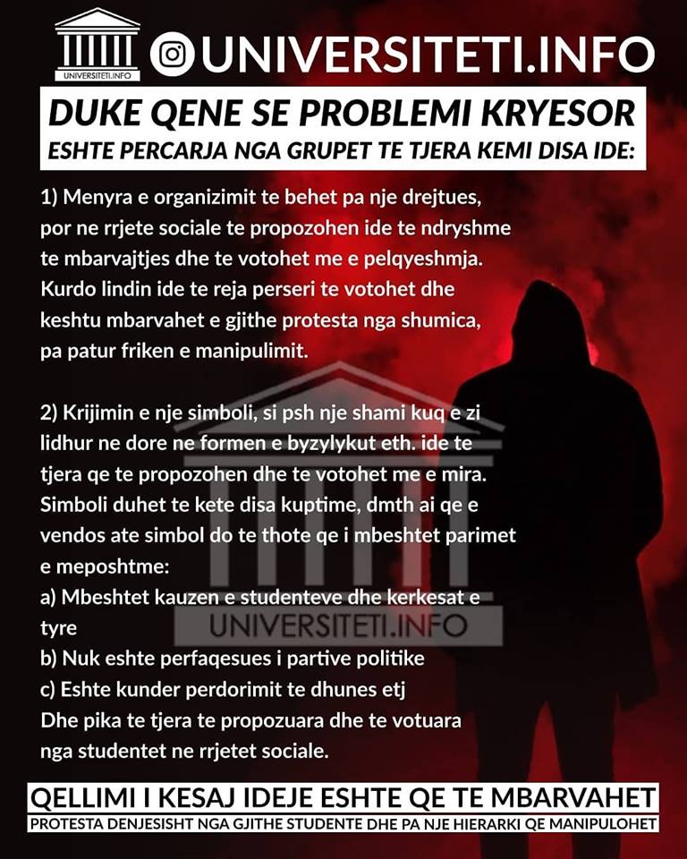 “Studentët në protestë para Ministrisë së Arsimit po përballen me një fushatë të koordinuar dezinformimi dhe orvatjesh për t’i përçarë.Lëvizja Për Universitetin u bën thirrje të gjitha partive politike që të ndalin veprimet përçarëse ndaj studentëve. Edhe më fort se nga ne, thirrja për mospërfshirjen e partive vjen nga mijëra studentë njëzëri. Janë ata që e kanë kuptuar se partitë kanë vetëm një interes: përçarjen e studentëve dhe instrumentalizimin e protestës për agjendat e tyre”.
