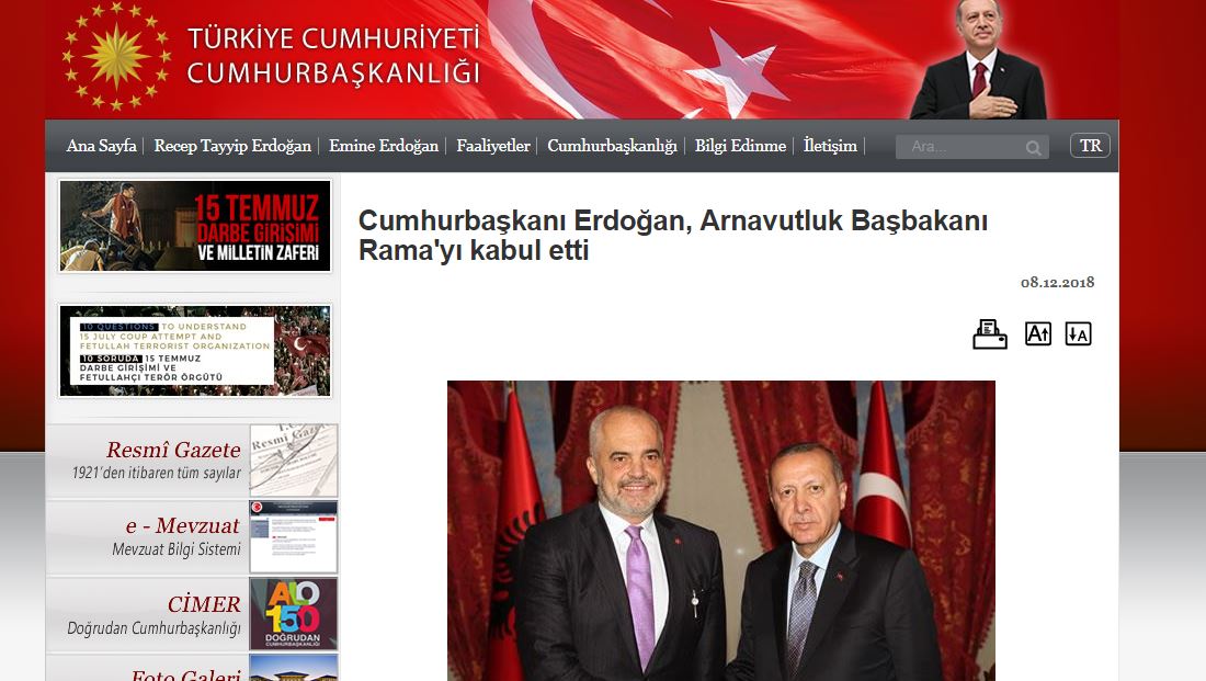 Nuk ka një njoftim të vizitës së Ramës në Turqi, ndërsa kjo është bërë i ditur nga faqja zyrtare e Presidentit turk, ku janë publikuar pamjet e takimit.