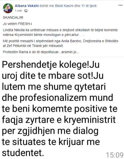 Deputetja e Partisë Demokratike, Albana Vokshi ka publikuar një mesazh që sipas saj u është dërguar arsimtarëve për të bërë komente pozitive në faqen e Facebookut të kryeministrit Rama në fjalën e tij për dialog me studentët.
